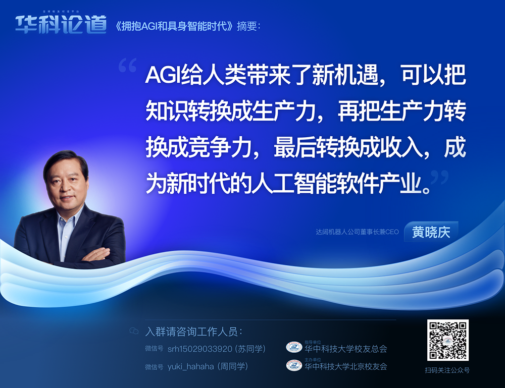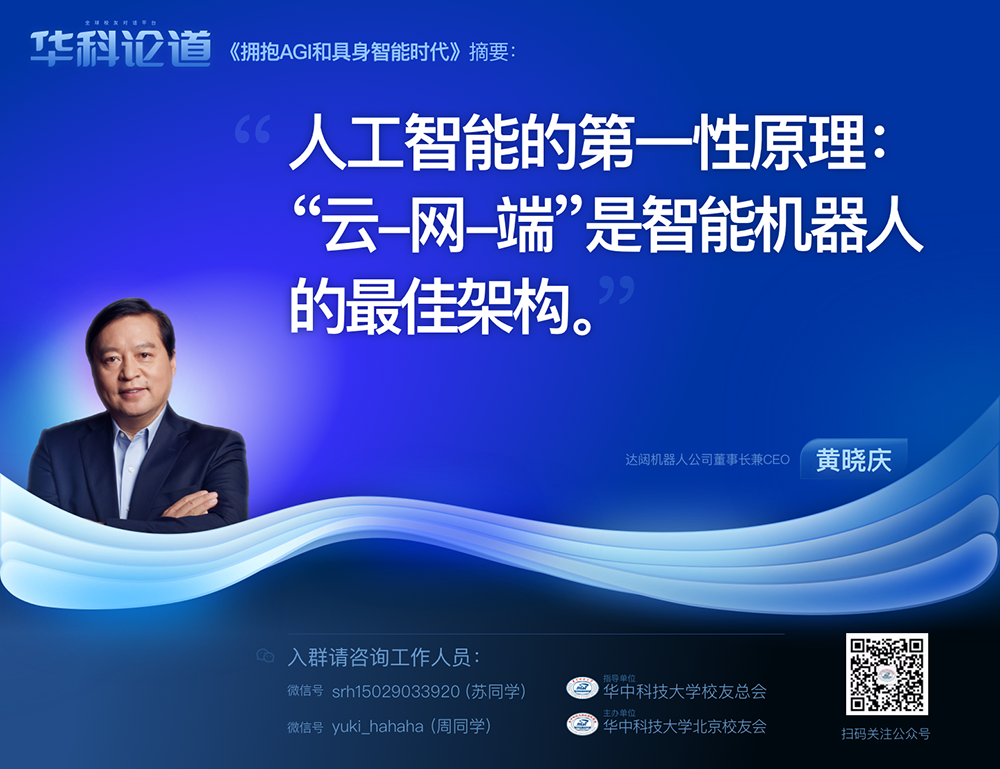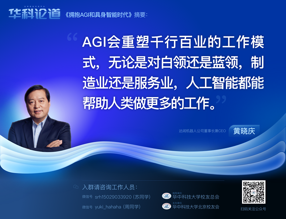 1月30日,在第五十五期「華科論道」上,由華中科技大學北京校友會主辦的活動迎來了一位特別嘉賓——達闥機器人公司董事長兼CEO黃曉慶先生,他帶來了「擁抱AGI和具身智能時代」的主題演講,為廣大校友帶來了精彩紛呈的分享。